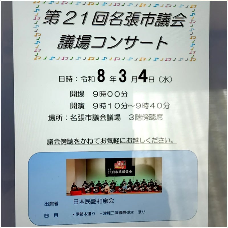 一般質問の初日(3月4日)には、「第21回名張市議会・議場コンサート」が開催されます。
