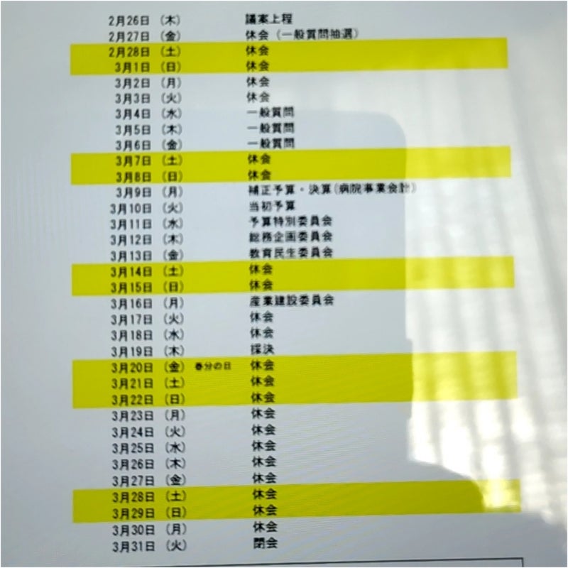 2月26日に議案上程日、3月19日に議案採決日、そして3月31日に、令和7年度通年議会の閉会となります。
